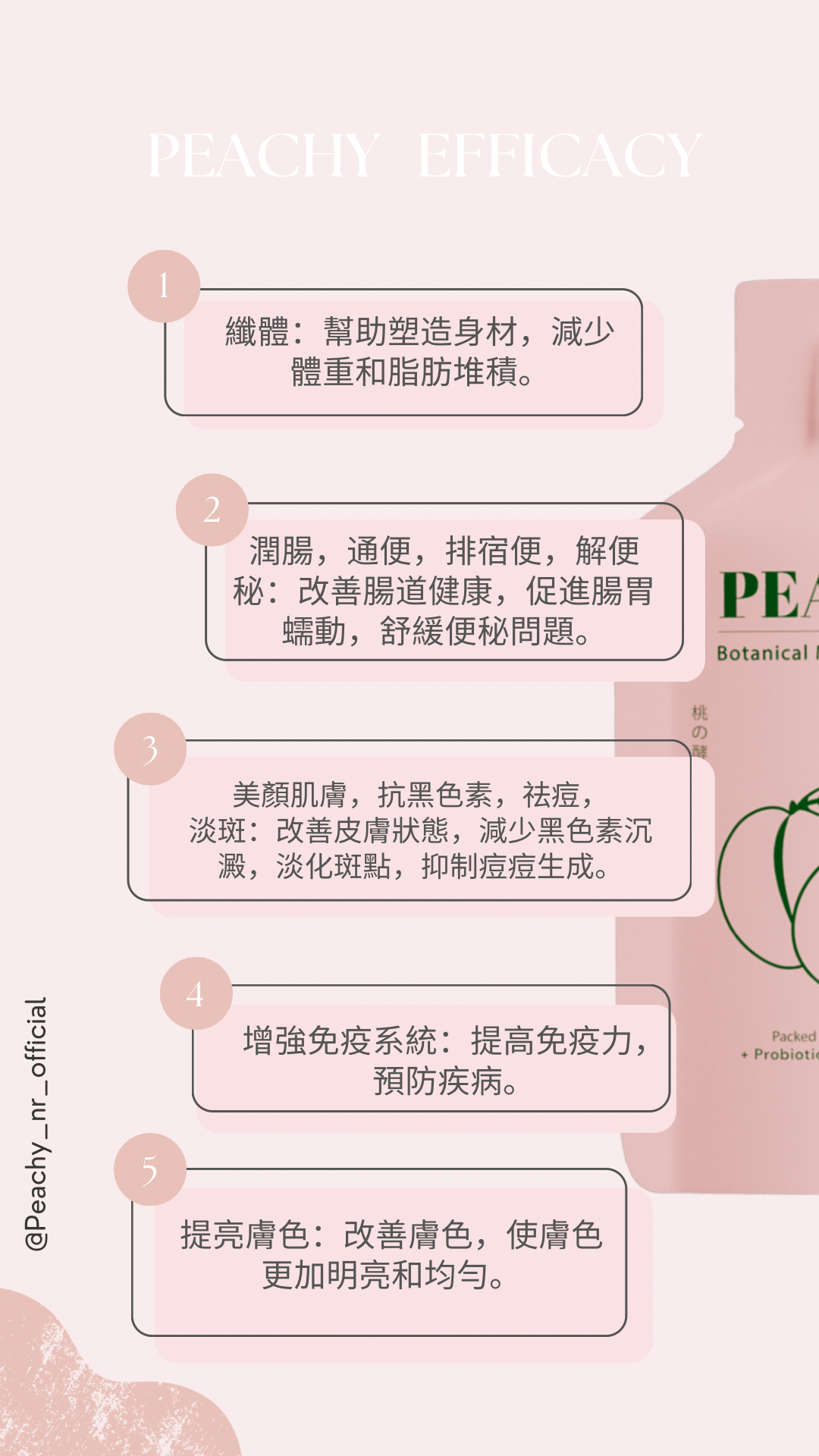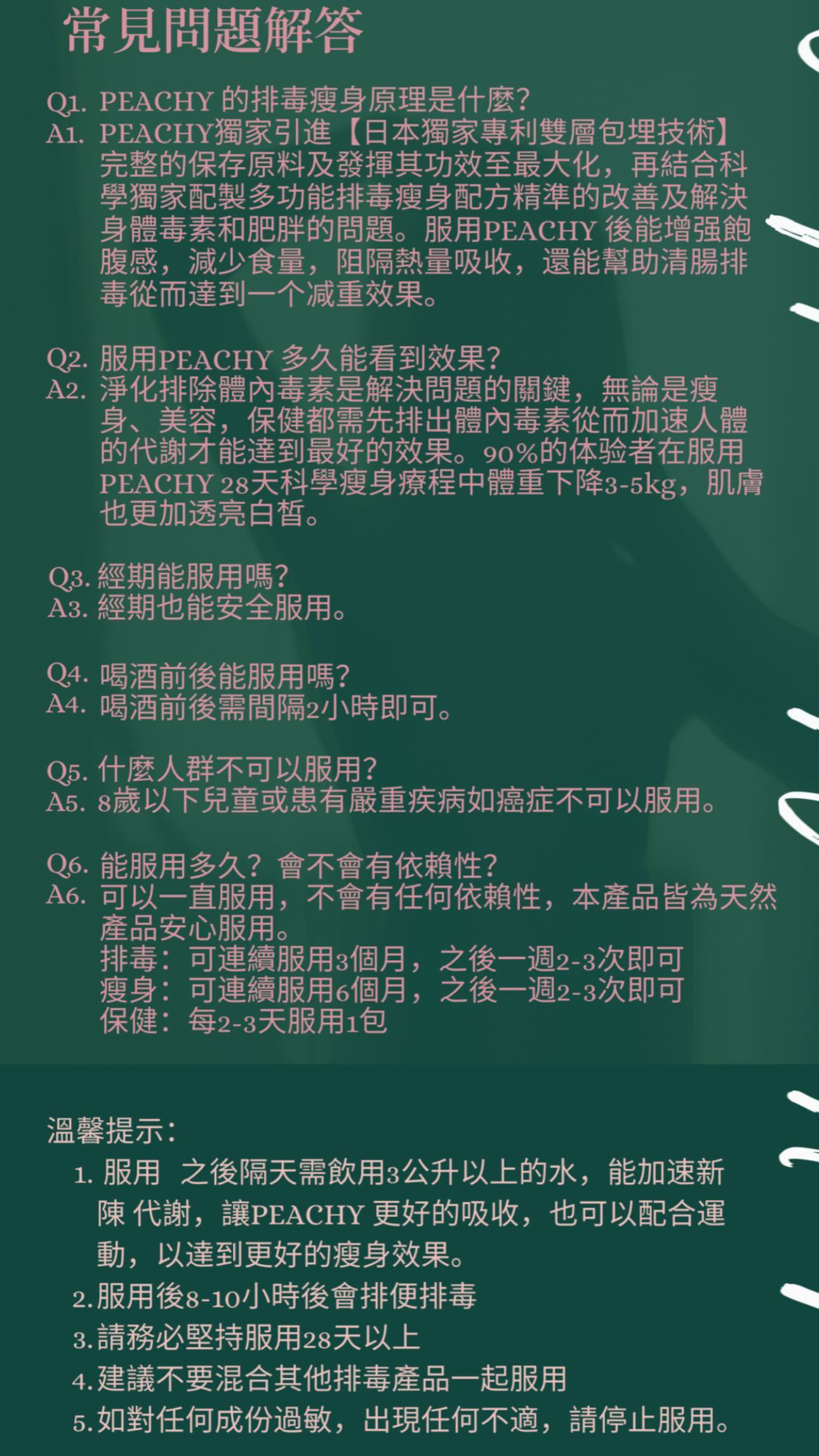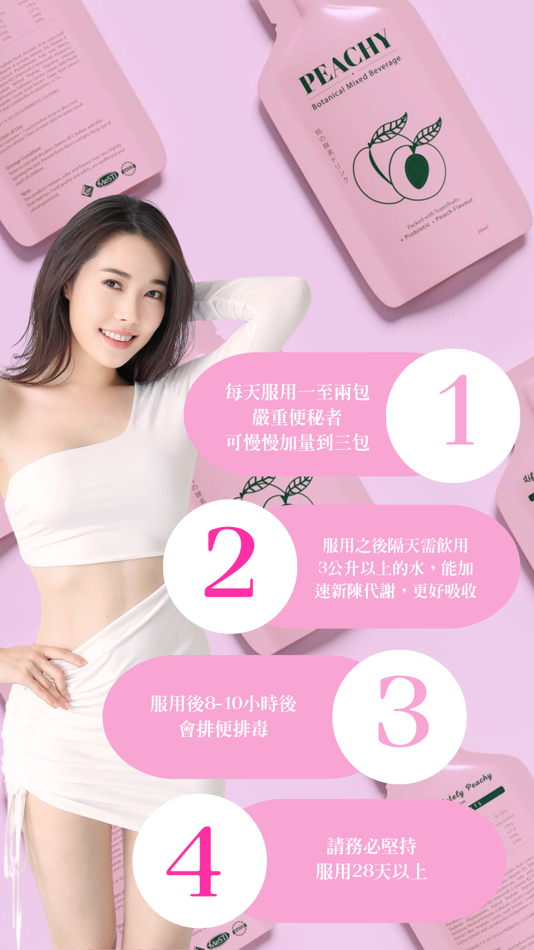 •服用之後隔天需飲用3公升以上的水,能加速新陳代謝,讓PEACHY 更好的吸收,也可以配合運動,以達到更好的瘦身效果。